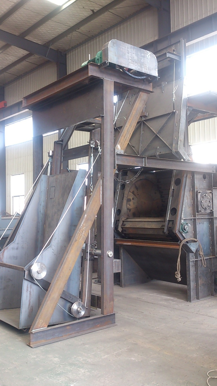 门靠装在上方的双级减速器带动卷筒使门升降开关,运行平稳可靠。门内壁衬有可更换的耐磨护板,门下边的滚轮沿着固定轨道平稳移动。门的周边设有迷宫式密封装置,以防止弹丸外溢,还可防止门与密封装置之间因弹丸而引起堵塞,门内侧上的挡板可防止工件在门与履带之间堆积。