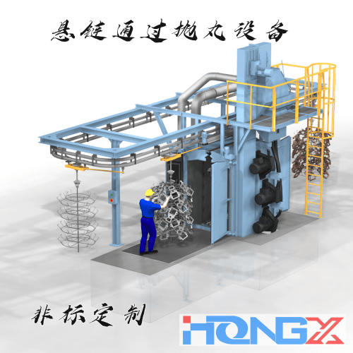 Q38系列悬链通过式抛丸清理机适用于大批量中小工件的抛丸处理,工件随吊链可连续运行,可采用单行程或双行程方式,前后辅室密封严密,工件边运行边旋转清理,单钩吊重50-200kg,生产